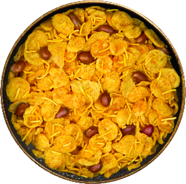 Gram Pulse Flour, Maize Starch, Corn Flakes, Peanuts, Edible vegetable oil (Ground nut, Palmolein, Cotton Seed, Corn), Sugar, Raisins, Spices and Condiments{Black Salt, Chilli Powder, Jeeravan, Black Pepper Powder, Asafoetida, Turmeric Powder}, Iodized Salt, Acidity regulator (INS 330).