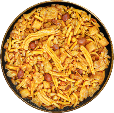 Gram Pulse Flour, Maize Starch, Gram Pulse, Peas, Lentil, Rice Flakes, Corn Flakes, Peanuts, Edible Vegetable Oil (Ground Nut, Palmolein, Cotton Seed, Corn), Sugar Powder, Spices & Condiments {Turmeric Powder, Fennel, Black Salt, Jeeravan, Coriander Seeds, Chilli Powder, Asafoetida, Carom Seeds, Black Pepper powder, Cinnamon, Star Anise, Caraway Seed, Clove Powder, Black Cardamom, Stone Flower, Bay Leaves, Long Pepper, Nutmeg, Mace, Ceylon Ironwood} Iodized Salt, Acidity regulator (INS 330), Raising Agent (E 500(ii)).